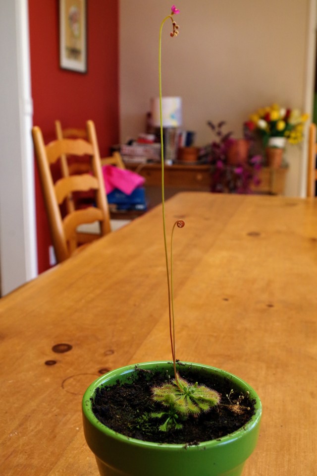 Sundews (Drosera) are famous for eating bugs by trapping them in the sticky tentacles on their leaves. But they still need bugs occasionally to reproduce. When it comes time, the plant builds an enormous stalk to put its flowers at arm’s length. Any pollinators visiting their tiny blooms won’t be at risk of becoming the victim of friendly fire.
