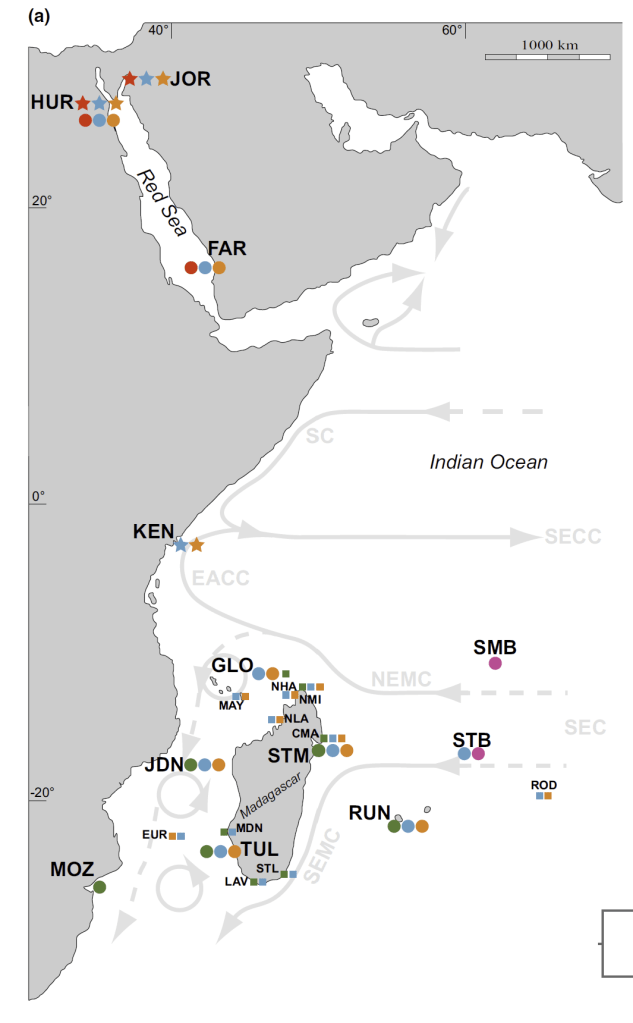 The researchers of this new paper propose that T. squamosina was more likely to have initially branched off due to the barrier of the Horn of Africa. The seas off of Kenya and Somalia harbor a meeting of southward and northward currents which then group and head offshore, away from the reefs that giant clam larvae are trying to get to. So any tiny floating planktonic clam larvae would experience a strong “headwind” preventing them from crossing that point. It would also mean that during times that the Red Sea was not a happy place to be a clam, T. squamosina may have found refuge on the coasts of places like Eritrea, Oman and possibly even as far as Pakistan. During times when sea levels rose and Red Sea conditions became friendlier, it recolonized the area.