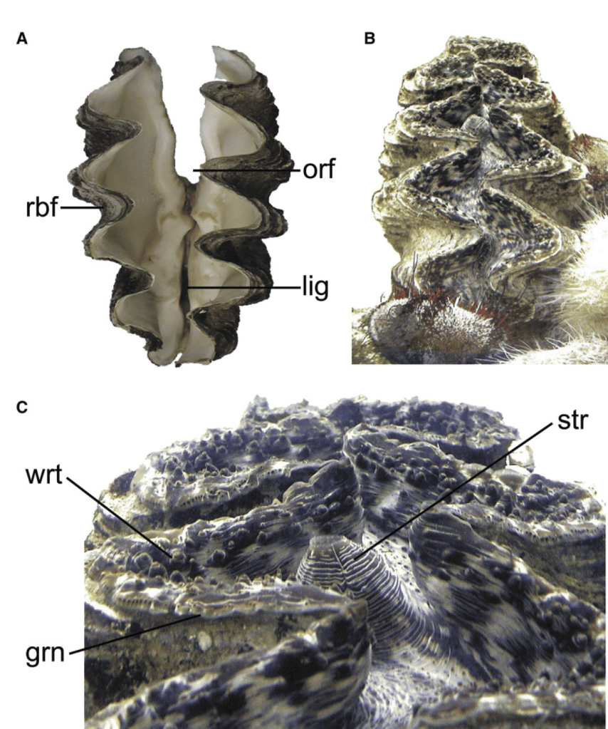 It turns out such puzzles are frequent among the giant clams. These unusual bivalves are specialists in coral reef environments, growing to large size with the help of symbiotic algae that create sugars through photosynthesis. Within the genus Tridacna there are ~10 accepted species which vary in size, shape, color and mode of life.