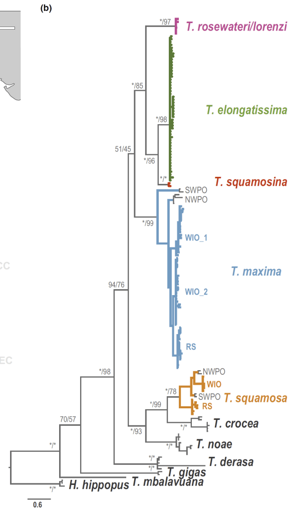 I figured that someday, researchers would collect tissue samples from these mystery clams to settle whether they were actually T. squamosina or something else. And this year, a team did just that, traveling along the coast of Mozambique, Madagascar, Kenya and other places, collecting samples of tissue to compare how all the different clams they saw were related in a family tree. They genetically sequenced these “clamples” and in the process, found that the mystery clams were a new cryptic species, which they called T. elongatissima!