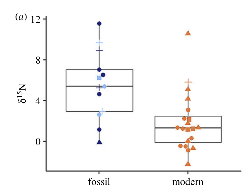Nitrogen isotopes provide us with a useful and detailed record of food webs. Plants and algae tend to have more of the light isotope of nitrogen in their tissues than the animals that eat them (primary consumers), and the animals that eat those animals have even higher nitrogen isotope values. We can measure the amount of “heavy” atoms of nitrogen with a unit called δ¹⁵N (“delta 15 N”). A carnivore at the top of the food chain will have a very high δ¹⁵N, while plants will be the lowest. Clams, typically being filter feeders, will usually have an intermediate value, since they’re eating a lot of phytoplankton (tiny microscopic floating algae) and zooplankton (animal plankton that eat other plankton).