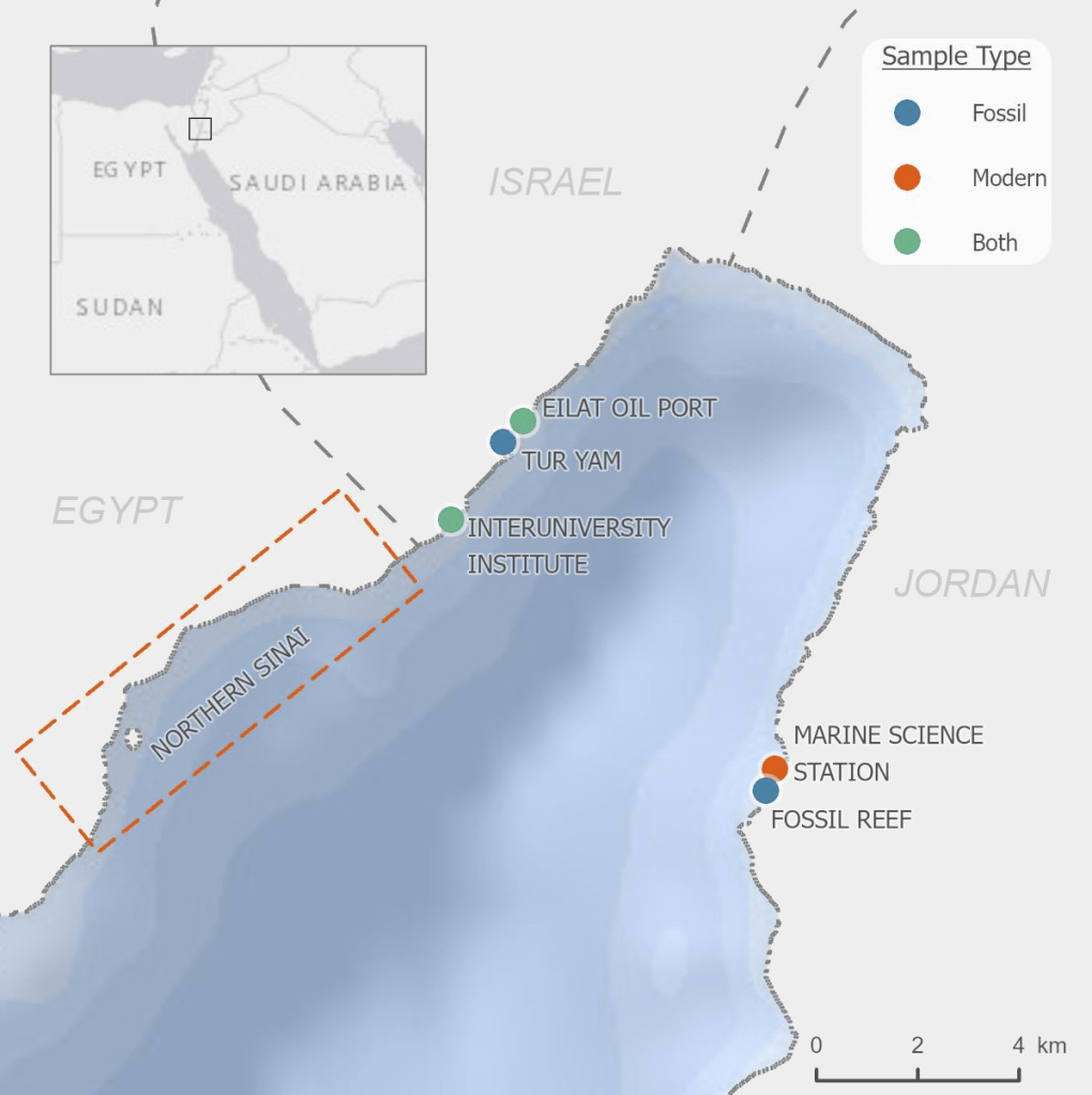 So I gathered a team of talented collaborators and set out to test that hypothesis, using giant clam shells that I was able to get on loan from the Hebrew University of Jerusalem Museum. These shells had been confiscated from poachers at the Egypt-Israel border. While I would have rather known these clams were still alive in the waters of the Northern Red Sea, being able to use them for research to understand the biology of their species was the next best thing! I had originally planned on pursuing a postdoc undertaking this project with Rowan Martindale, a professor at UT Austin who has studied the nitrogen isotopes of photosymbiotic corals, but when I started up at Biosphere 2, we ended up continuing with the project anyway as a collaboration! We measured the nitrogen isotopes of the shell material in the lab of Christopher Junium, a professor at Syracuse University, who has developed an exquisitely sensitive method to measure the nitrogen from shell material by essentially burning the shell powder and then scrubbing out unwanted material to isolate the nitrogen, to measure the isotopes in a machine called a mass spectrometer. Katelyn Gray is a specialist in isotopes of biominerals and assisted with drilling out powder from the shells with a Dremel. Shibajyoti Das, now at NOAA, is a specialist in measuring the shell nitrogen isotopes of other bivalves and he was master at doing much of the mass spectrometer work, and assisting in interpretation. Adina Paytan is a professor at UC Santa Cruz. She first provided the funding and support for me to go to the Gulf of Aqaba and collect these shells as part of an NSF-funded student research expedition! She also provided environmental data which helped us to interpret what the clams were actually eating!