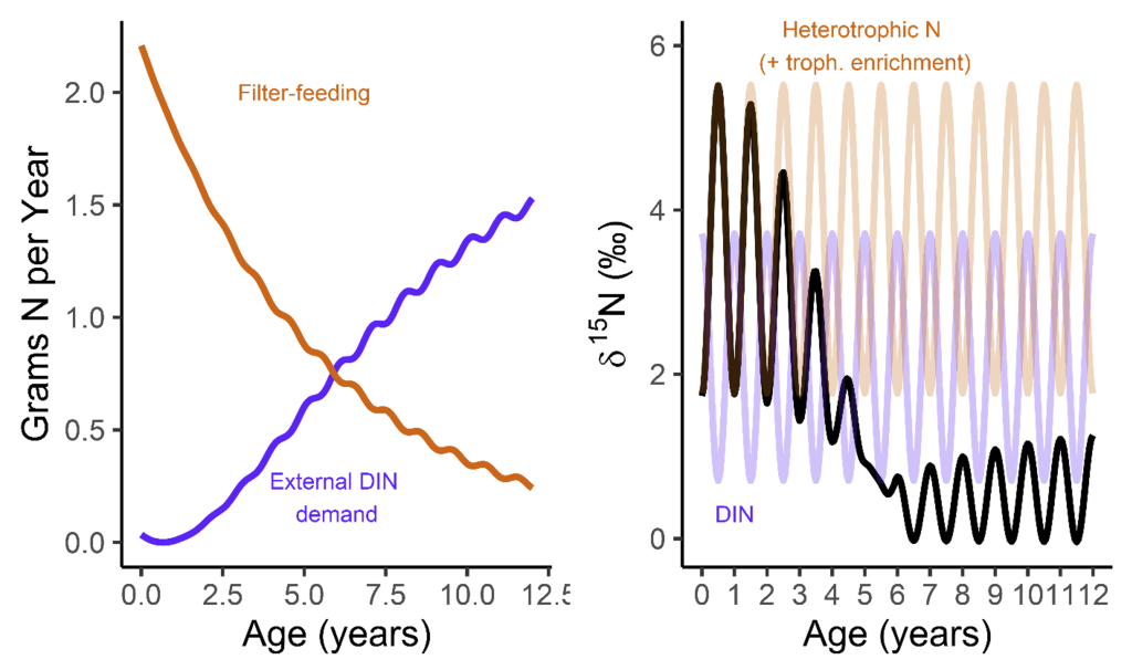 There was one clam that differed from the others in showing low δ¹⁵N values through life in its hinge shell layer. To help explain these differences, I created an independent model of the clams’ internal chemistry based on their growth rate, which slows as they age, and also is faster in the summer. When the clams are young filter feeders, they get most of their nitrogen from plankton, debris and other material floating in the water column making up floating material we call Particulate Organic Matter (POM). Meanwhile, when they are in their photosynthetic life stage, they get most of their nitrogen from nitrate, which is essentially Miracle Gro for the symbionts. The model showed that the clams should record a flip from filter feeding to photosynthesis around 4-5 years of age, which was confirmed by three of the shells! But what about the one that didn’t show this trend? My colleague Adina had fortunately measured the isotopes of POM and nitrate in different seasons in the Gulf of Aqaba. We found that in summer, as expected, POM δ¹⁵N is lower than nitrate. In the winter, meanwhile, that relationship is flipped! So if a clam grew more in winter, it would not record the same transition as was seen by the other clams. We think the clam that was the exception to the rule might have been more of a winter grower.